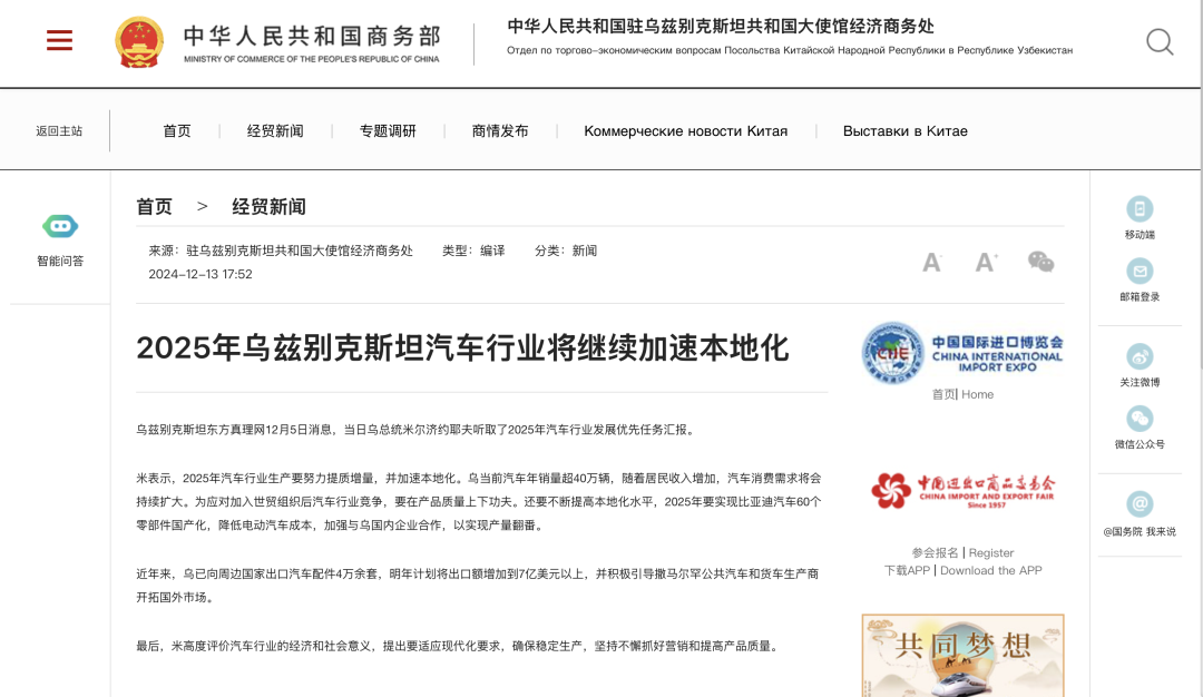 面对新能源转型的需求,乌兹别克斯接轨中国电动汽车标准,并探索合资模式。