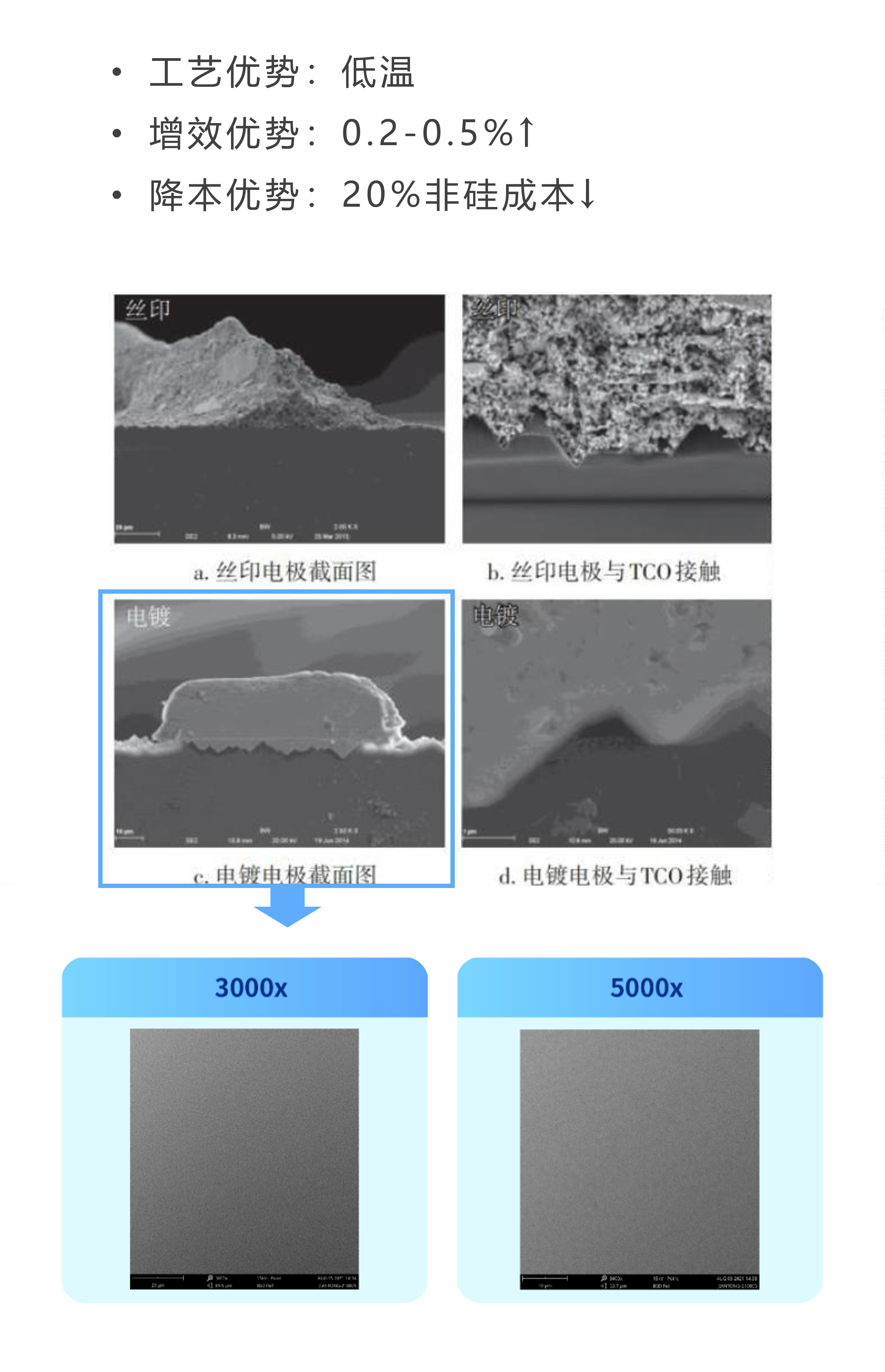 座谈会中提到,成本高昂是制约HJT电池大规模产业化的关键因素,降本提效已经迫在眉睫。高效单晶异质结太阳能电池电镀,因其具备全面降低成本、进一步提高效率的优势,是传统丝网印刷银浆工艺的最佳替代方案之一。作为其核心原料,高效单晶异质结太阳能电池电镀添加剂(铜、锡)产品具有广阔的应用空间。
